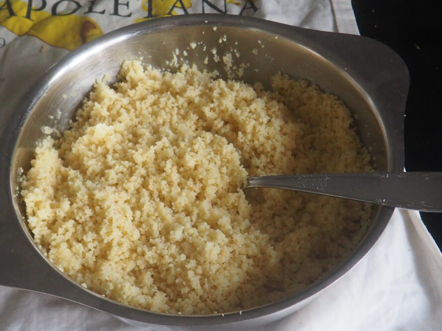 • Prepare o cuscuz conforme as instruções da embalagem. Em uma tigela coloque a água morna e o cuscuz, cubra com a tampa. Deixe descansar por alguns minutos, o cuscuz terá absorvido a água e estará inchado. Agora adicione duas ou três pitadas de sal, duas colheres de azeite e solte-o com um garfo. Se preferir, você também pode soltá-lo com as mãos.