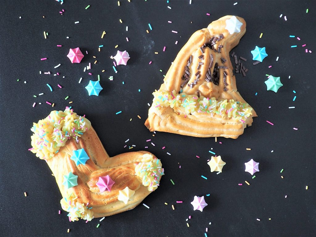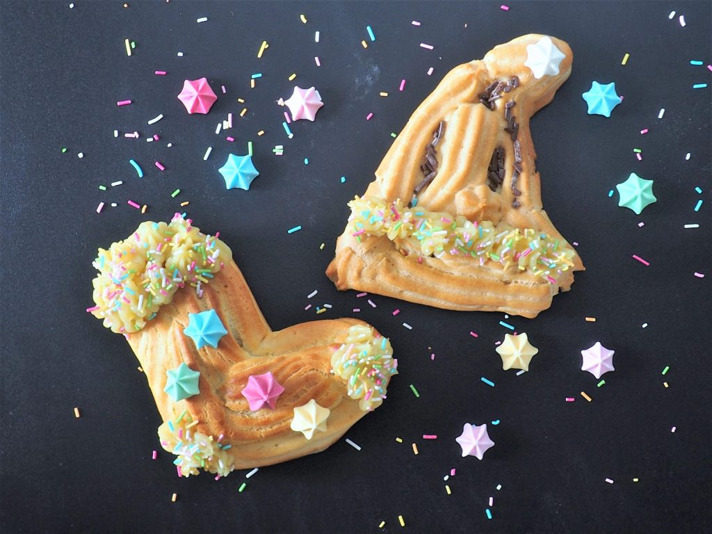 Prepare a massa choux (para a receita, clique no link) com as quantidades indicadas na receita, ou seja, 5 ovos, 200 ml de água, 200 g de farinha, 100 g de manteiga e uma pitada de sal. Coloque a massa em uma seringa com bico largo. Faça as formas da meia e do chapéu à mão livre na assadeira forrada com papel manteiga. Asse no forno a 180° por cerca de 30 minutos, colocando na terceira prateleira do forno a partir de baixo.