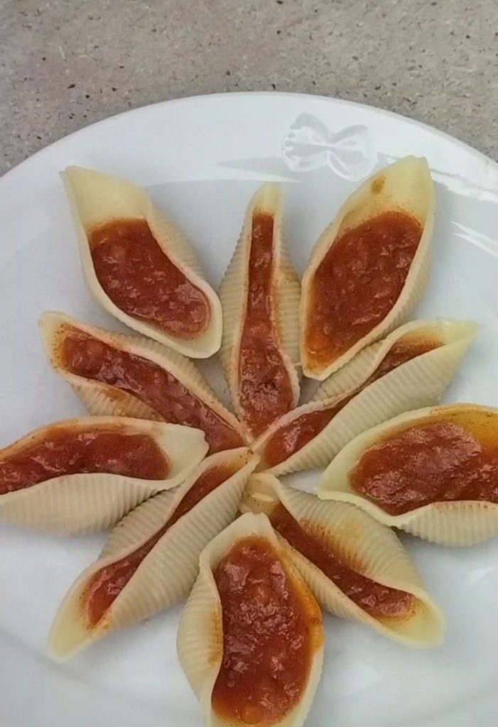 Disponha cinco em um prato posicionados em forma de estrela, tente usar os mais abertos para a parte central. Agora posicione outros cinco conchiglioni como na figura. Nesse caso, escolha os ligeiramente mais fechados.