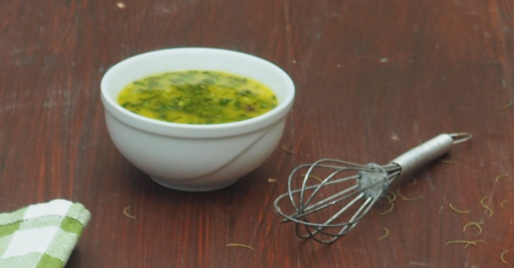 Quando o sal estiver completamente dissolvido, adicione o azeite aos poucos, continuando a emulsionar até que os ingredientes estejam bem misturados.