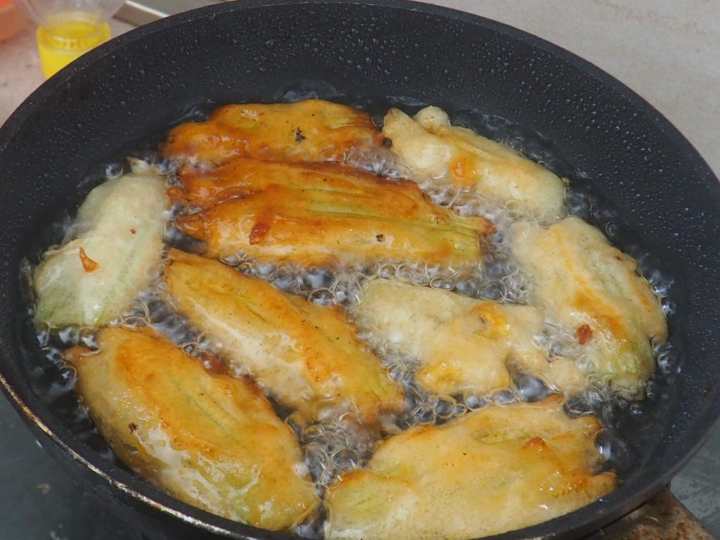 Despeje o óleo em uma frigideira, aqueça bem. Passe as flores de abóbora na massa e depois mergulhe-as no óleo.