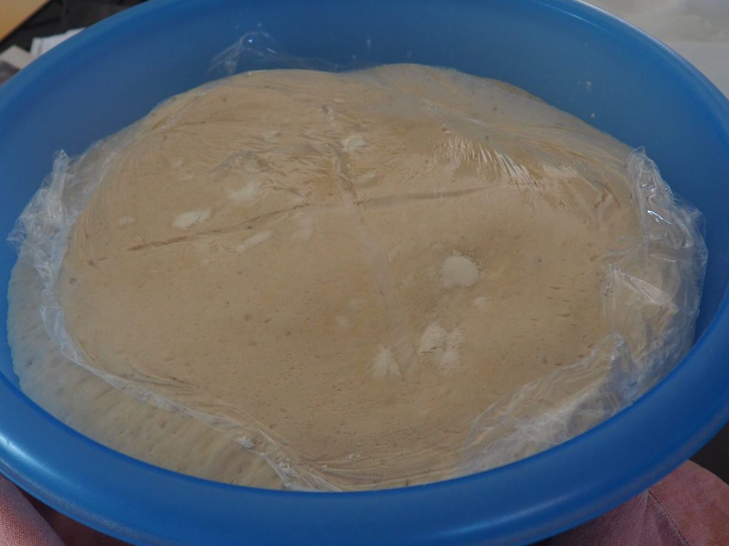 Uma vez decorrido o tempo, sua massa terá triplicado. Retire do recipiente, coloque sobre uma superfície enfarinhada, amasse novamente e divida em dois pães, um maior e outro ligeiramente menor (envolva-os em filme plástico para evitar que sequem).
