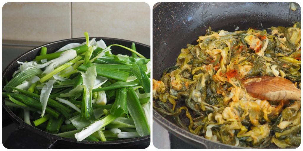Coloque um pouco de azeite em uma frigideira e adicione a sponsale, sal e cozinhe em fogo baixo por cerca de 20 minutos, ou até secar bem. A chama deve ser baixa, para evitar que dourem e fiquem assim mais digestíveis. No final, ajuste o sal e adicione a páprica doce, misture e deixe esfriar ligeiramente.