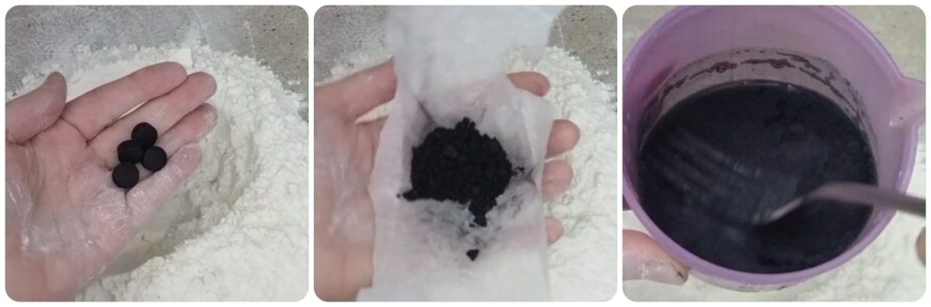 Adicione na água o carvão vegetal previamente reduzido a pó, misture bem para dissolvê-lo completamente.