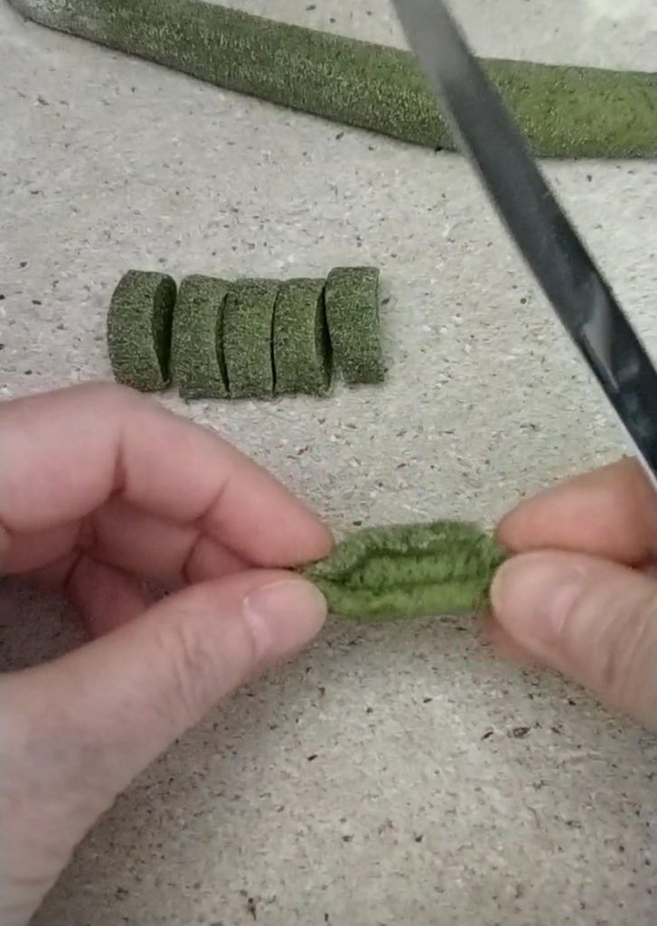 Agora comece a preparar as folhas de oliveira. Pegue um pedaço, posicione uma faca sem serra sobre a superfície, pressione levemente, puxando em sua direção. Recomendo colocar o polegar para não fechar.
