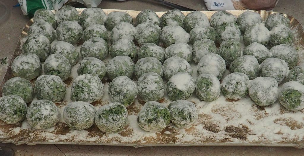 • Umedeça as mãos e faça bolinhas de aproximadamente 20 g cada (você fará cerca de 60). Enfarinhe uma superfície com cerca de 50 g de farinha e coloque os gnudi por cima, rolando-os bem na farinha.