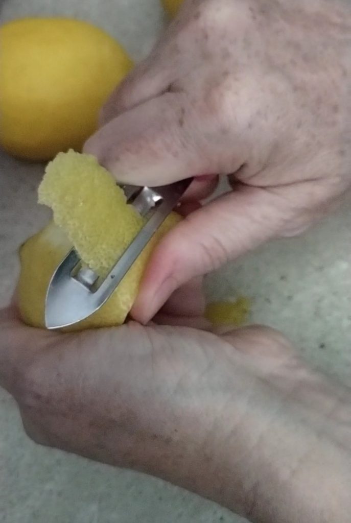 Agora, retire a casca com um descascador de batatas, tentando não ir muito fundo para evitar cortar a parte branca que pode ser amarga.