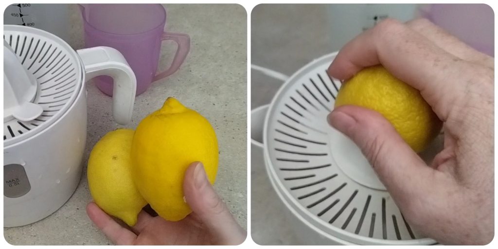 Para preparar o granizado de limão, prefira limões não tratados, orgânicos, já que utilizaremos também a casca. Lave os limões, corte-os ao meio, esprema o suco com um espremedor manual ou elétrico. Você deve obter 175 ml de suco, cerca de três limões não muito grandes serão necessários.