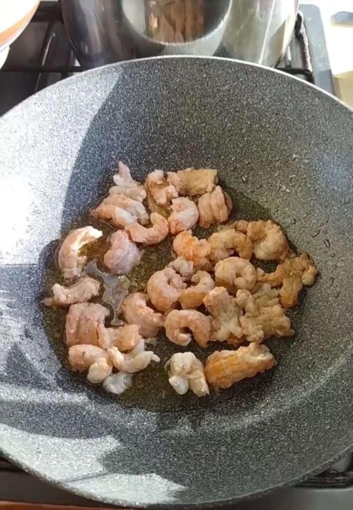 • Coloque um pouco de azeite na frigideira e adicione a polpa dos lagostins, salgue, apimente, tempere com um pouco de gengibre e salteie uma ou duas vezes.