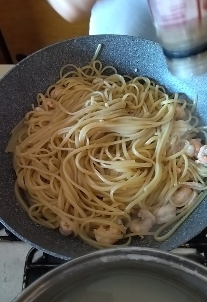 • Escorra as linguine bem al dente, coloque-as diretamente na frigideira com a polpa de lagostins e complete o cozimento da massa. Vai levar dois ou três minutos.