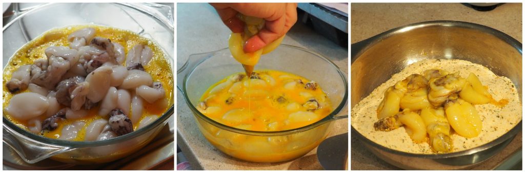 Agora, um pouco de cada vez, mergulhe as lulas descongeladas na mistura de ovos, escorra e depois passe na farinha de rosca aromatizada.