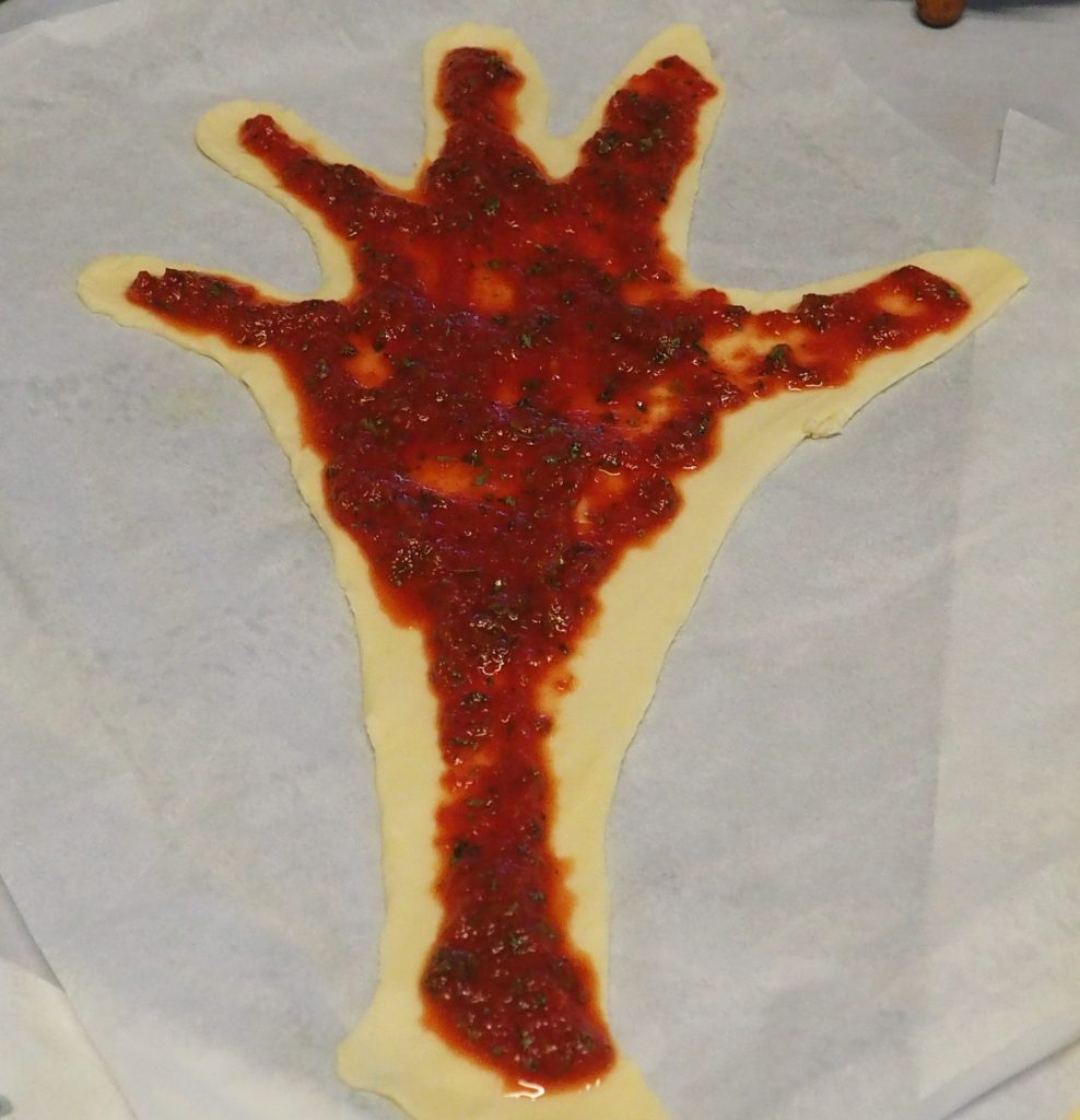 Minha filha adora pizza, mas não gosta de doces, então, para criar uma receita de impacto, eu quis preparar esta Mão de massa folhada salgada (Halloween) com um recheio que lembra pizza. Fácil e rápida, mas realmente saborosa! Ah, as formigas são falsas 🙂