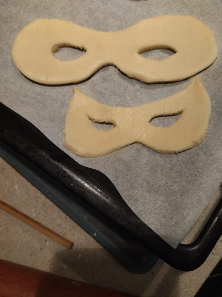 Estenda a massa com um rolo a uma espessura de cerca de 5-6 mm, para ter a mesma altura, ajude-se colocando dois palitos chineses nas bordas da massa enquanto a estende. Corte as mascarinhas em papel manteiga. As minhas são de aproximadamente 15 cm de largura e 3 cm de altura, e outra cerca de 10 cm de largura e 3 cm de altura, como nas figuras. Eu as preparei à mão, então não estão perfeitas!