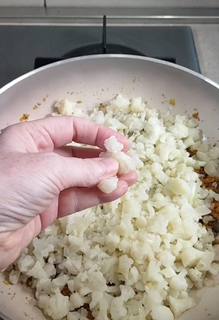 Corte os floretes de couve-flor em pedaços bem pequenos e coloque na frigideira.