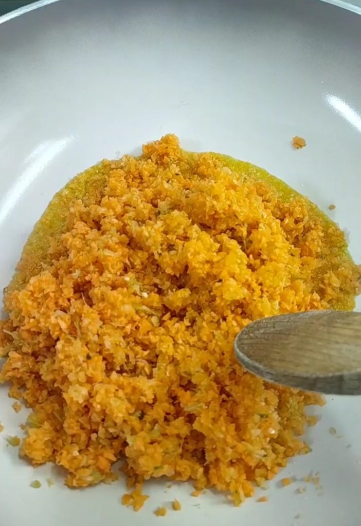 Em uma frigideira, coloque um pouco de azeite e aqueça, adicione os legumes picados e refogue por alguns minutos.