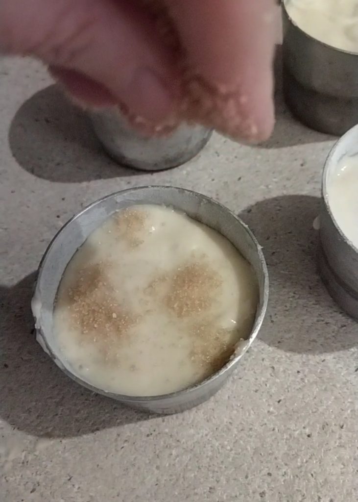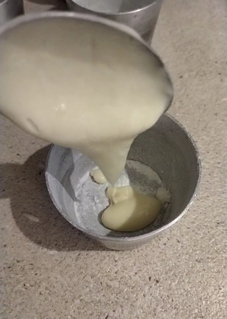 Unte com óleo as forminhas (as minhas têm altura de 5,5 cm e diâmetro de 7,5 cm), polvilhe com farinha. Agora, proceda em camadas, começando com uma colher de massa.