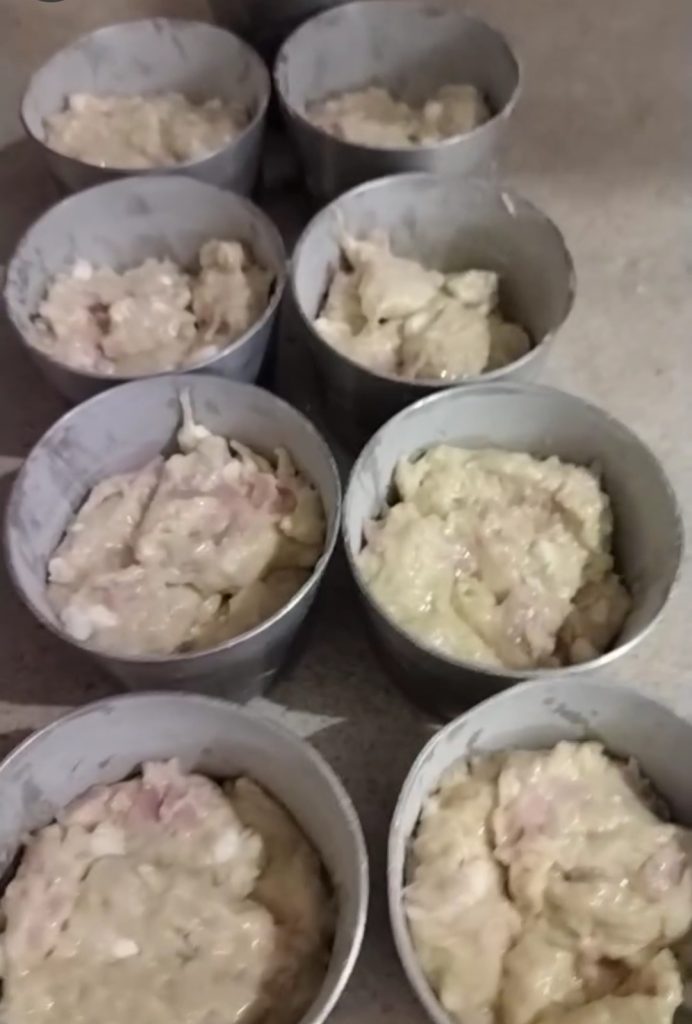 Enquanto isso, unte e enfarinhe as formas. Agora preencha até três quartos. Eu consegui 9 peças, minhas formas têm 6 cm de diâmetro e 5 cm de altura.