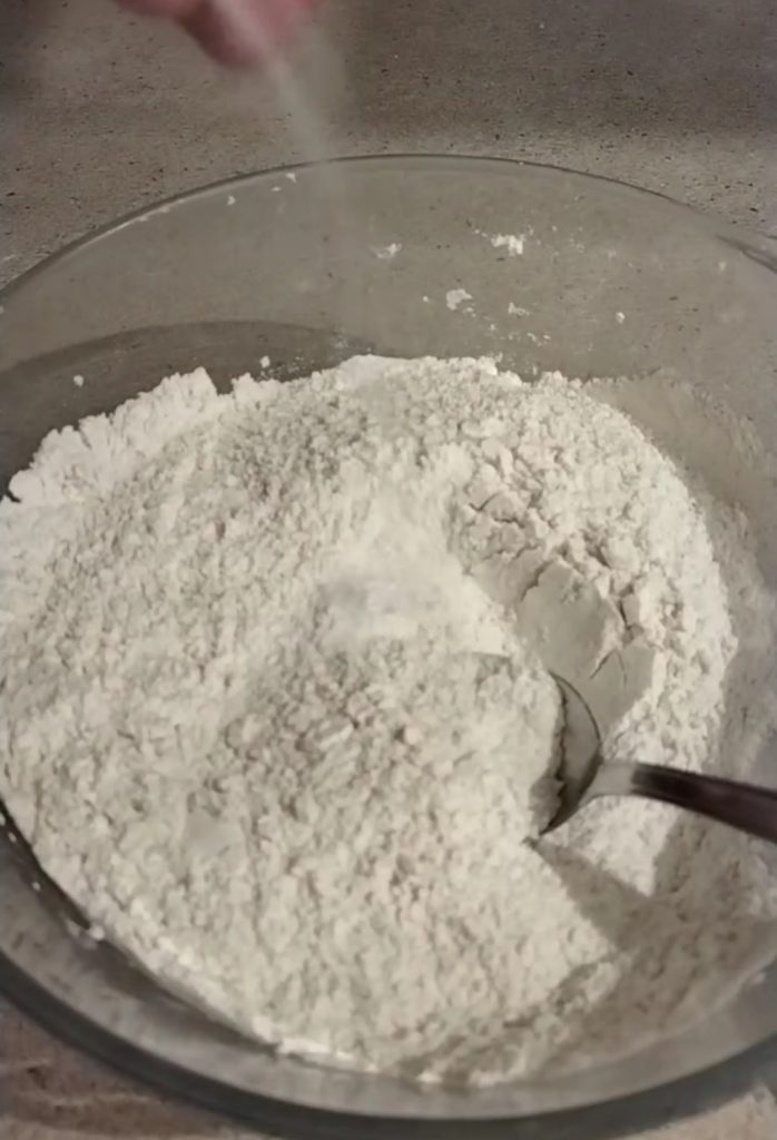 Em uma tigela, comece colocando os ingredientes secos: misture a farinha com o parmesão.