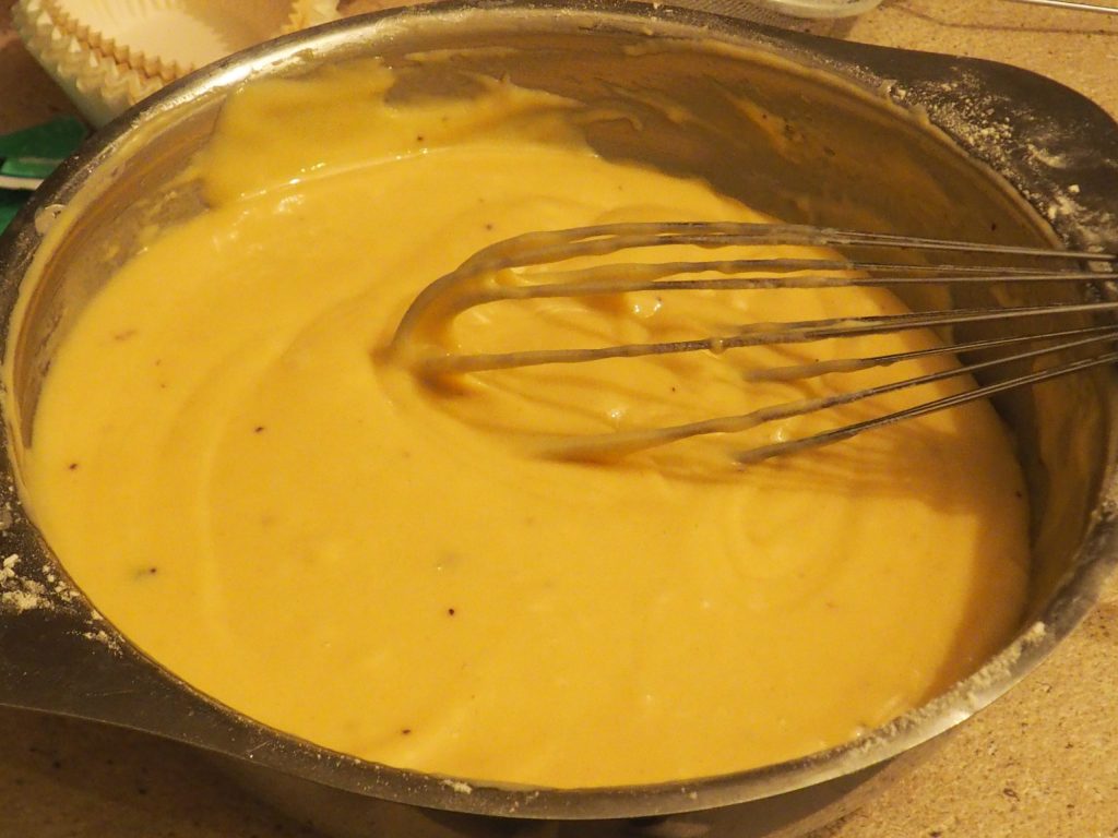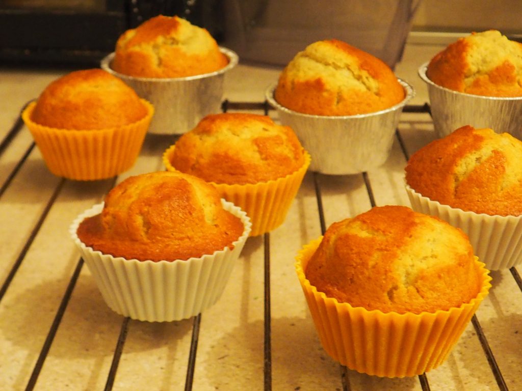 Na assadeira do forno, coloque as forminhas que você deve encher até cerca de metade. Se você usar forminhas de tamanho 3,5 cm (de altura) e 6,5 cm de diâmetro, você terá 16/17. Eu fiz 12, mas usei forminhas de tamanhos diferentes.