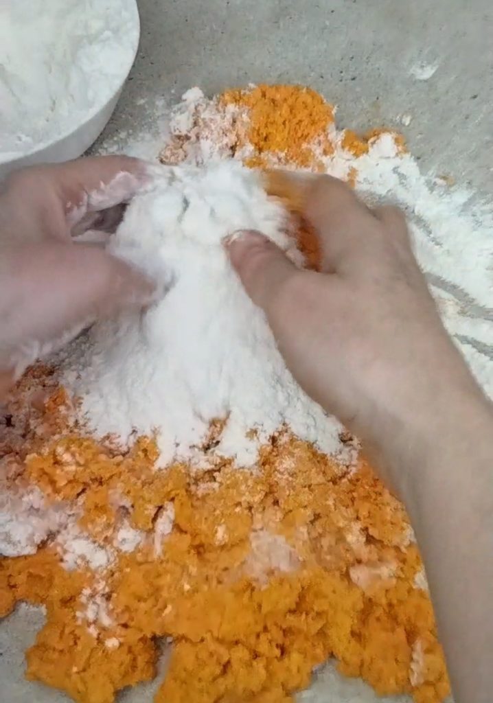 Quando as cenouras estiverem bem picadas, despeje-as em uma superfície enfarinhada e comece a amassar.