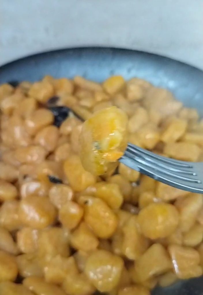 Eu usei diretamente uma escumadeira para escorrê-los e os joguei na frigideira onde já havia refogado a sálvia na manteiga. Salteie-os para dar sabor aos nhoques e sirva-os quentes. Você pode polvilhá-los com um pouco de queijo parmesão ralado.