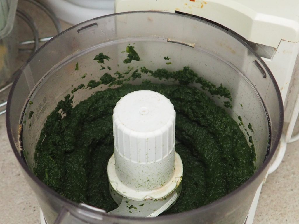 Em um processador de alimentos, coloque agora o espinafre, adicione cerca de 50g de água obtida após espremer e processe até obter uma mistura bem triturada.