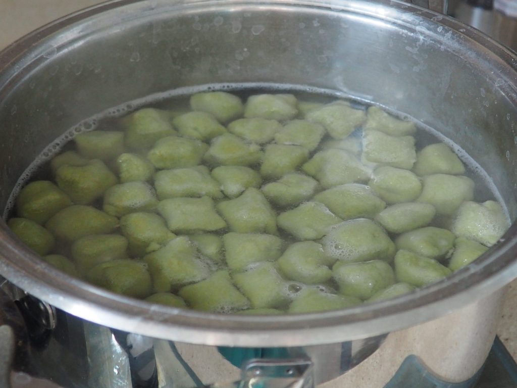 Em uma panela grande coloque bastante água, assim que ferver adicione o sal grosso e coloque os nhoques. Cozinhe por alguns minutos, quando subirem à superfície estão praticamente cozidos. Escorra bem em um escorredor.