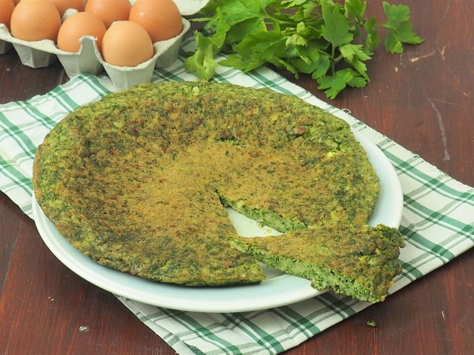 A erva amarga, cujo nome científico é Tanacetum balsamita, talvez mais conhecida como Erva de São Pedro, tem folhas ligeiramente alongadas e largas, com bordas serrilhadas, um leve perfume de menta/limão e um gosto ligeiramente amargo. Neste omelete, usei apenas duas folhas, mas se você gosta do sabor, pode colocar algumas a mais, sem exagerar, caso contrário pode ficar muito amargo.
