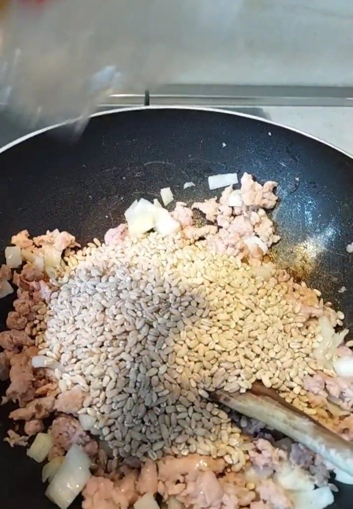 Depois de cozida a linguiça, adicione a cevada e deixe dourar ligeiramente.