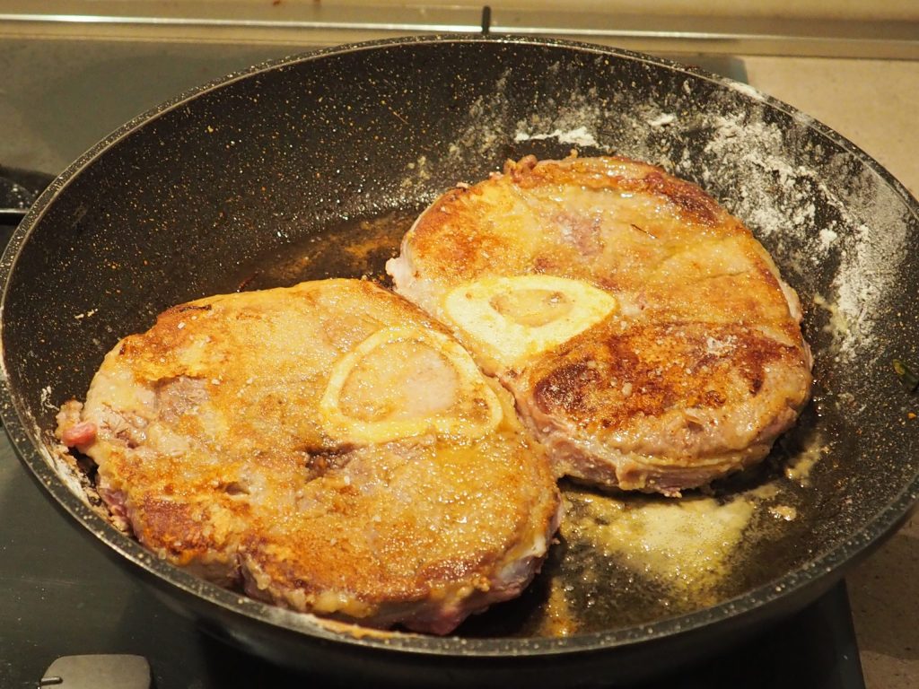 Na mesma panela onde cozinhou as cebolas, adicione um pouco de azeite, coloque os ossobucos enfarinhados e cozinhe por 5 minutos de cada lado.
