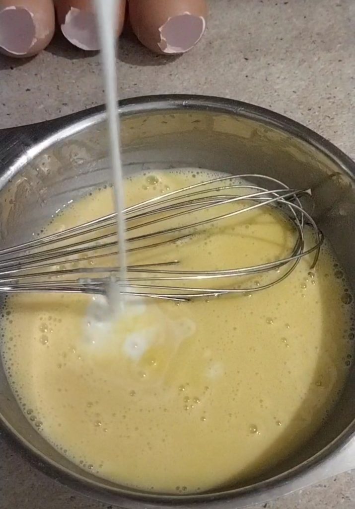 Bata bem com um batedor, tentando incorporar ar, a mistura deve ficar ligeiramente espumosa e lisa.