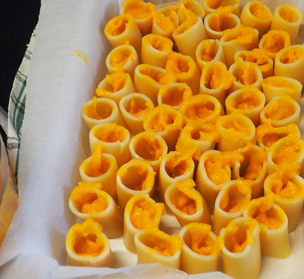 Pegue uma panela grande com bastante água, assim que ferver, adicione 3 colheres de chá de sal grosso e os paccheri. Escorra-os com um escorredor 3 minutos antes do tempo de cozimento indicado na embalagem. Forre uma assadeira de 30,5×23,5 cm com papel manteiga e posicione os paccheri em pé verticalmente. Comece a recheá-los com duas colheres de chá da mistura de abóbora.