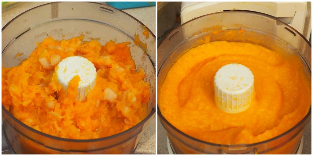 Neste ponto, coloque tudo em um mixer e bata até que a abóbora fique sem grumos e aveludada.