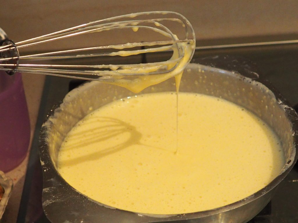 Bata com o batedor até que a mistura não fique muito densa e lisa, sem grumos.