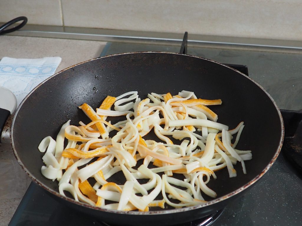 Em uma frigideira com um pouco de azeite, refogue o surimi desfiado.