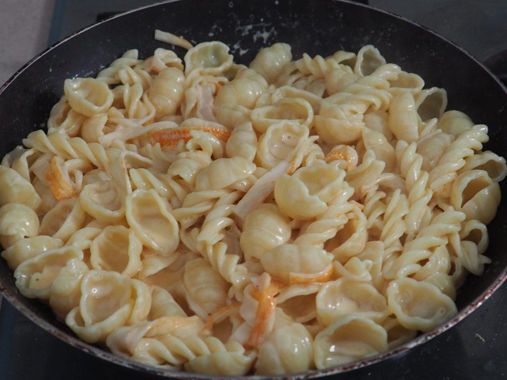Três minutos antes do tempo de cozimento, escorra a massa com uma escumadeira e coloque diretamente na frigideira com o surimi.