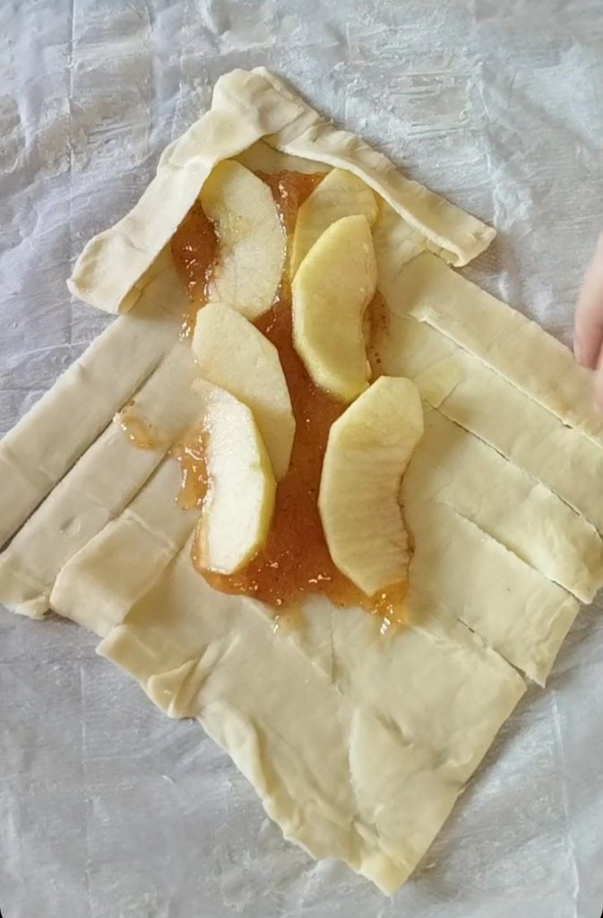• Coloque duas colheres de chá de geleia (eu escolhi figo e ameixa) no centro do quadrado, em cima de duas ou três fatias de maçã.
