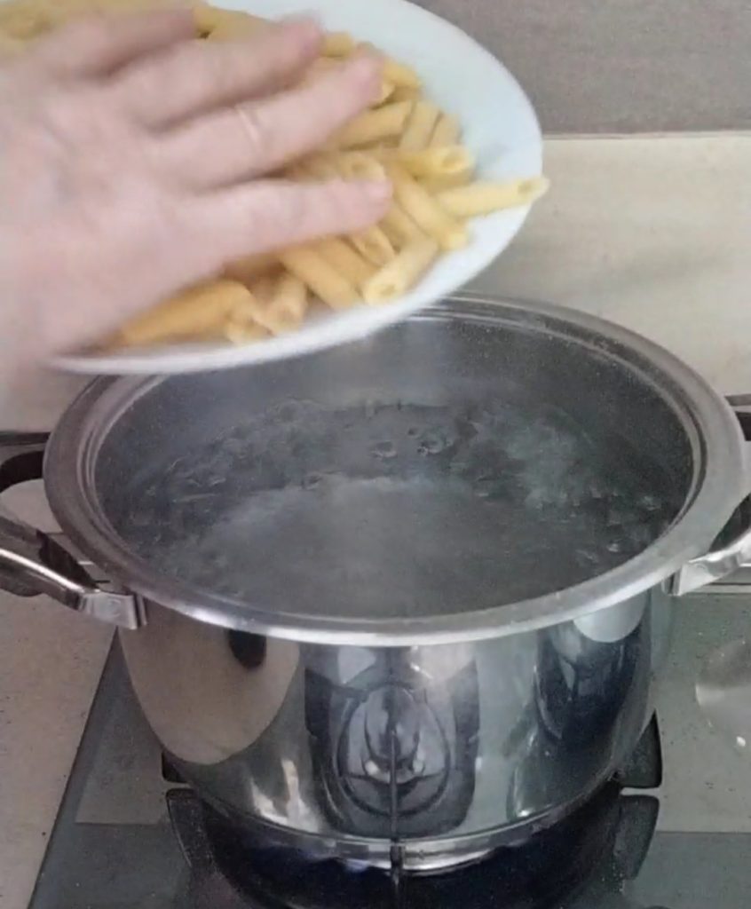 Em uma panela, coloque bastante água salgada, assim que ferver adicione o sal grosso e o macarrão. Cozinhe até ficar al dente.