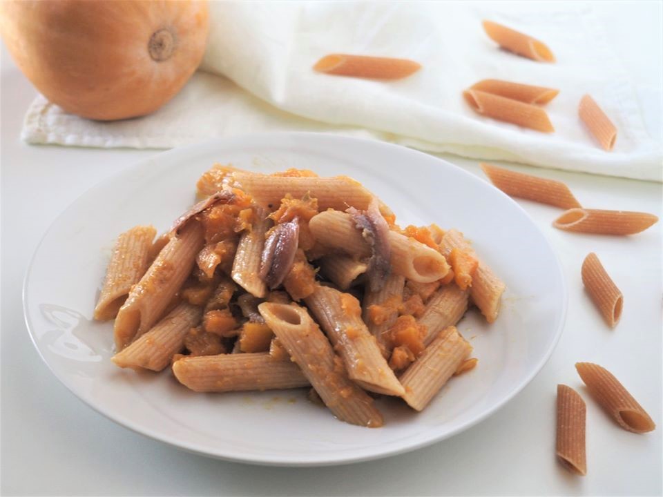 Penne integrais com abóbora e anchovas