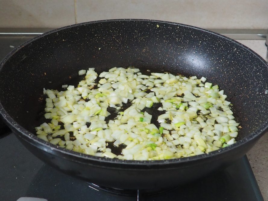 Limpe a cebola e pique finamente. Refogue em uma frigideira grande com um pouco de azeite.