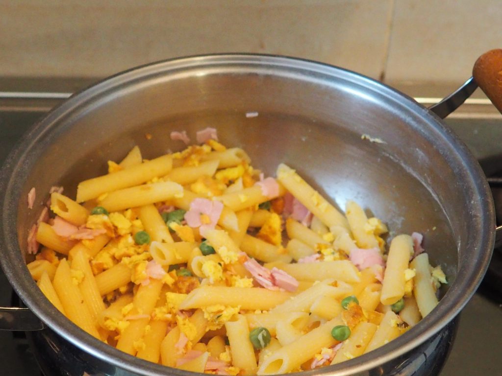 Coloque a massa escorrida de volta na panela fora do fogo, adicione os ovos mexidos, as ervilhas, o presunto, um pouco de molho de soja. Misture bem para integrar os ingredientes.