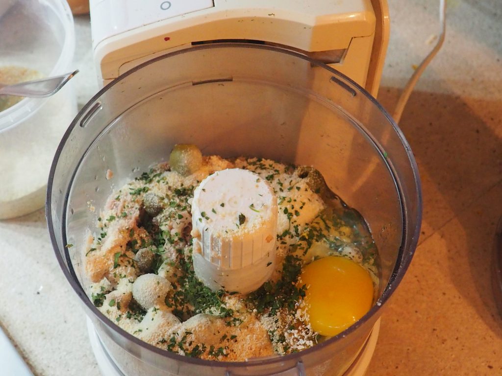 • Em um processador, prepare o recheio colocando o atum com seu óleo, as anchovas, as azeitonas e as alcaparras.