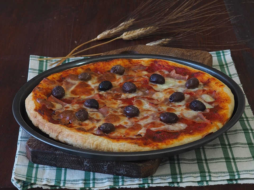 Para preparar a Pizza com presunto, mussarela e azeitonas você pode usar a receita da massa de pizza que encontra na seção O que é e como fazer, que obviamente você pode depois temperar a seu gosto. Aqui eu uso fermento biológico fresco e uma fermentação de pelo menos 6 horas.