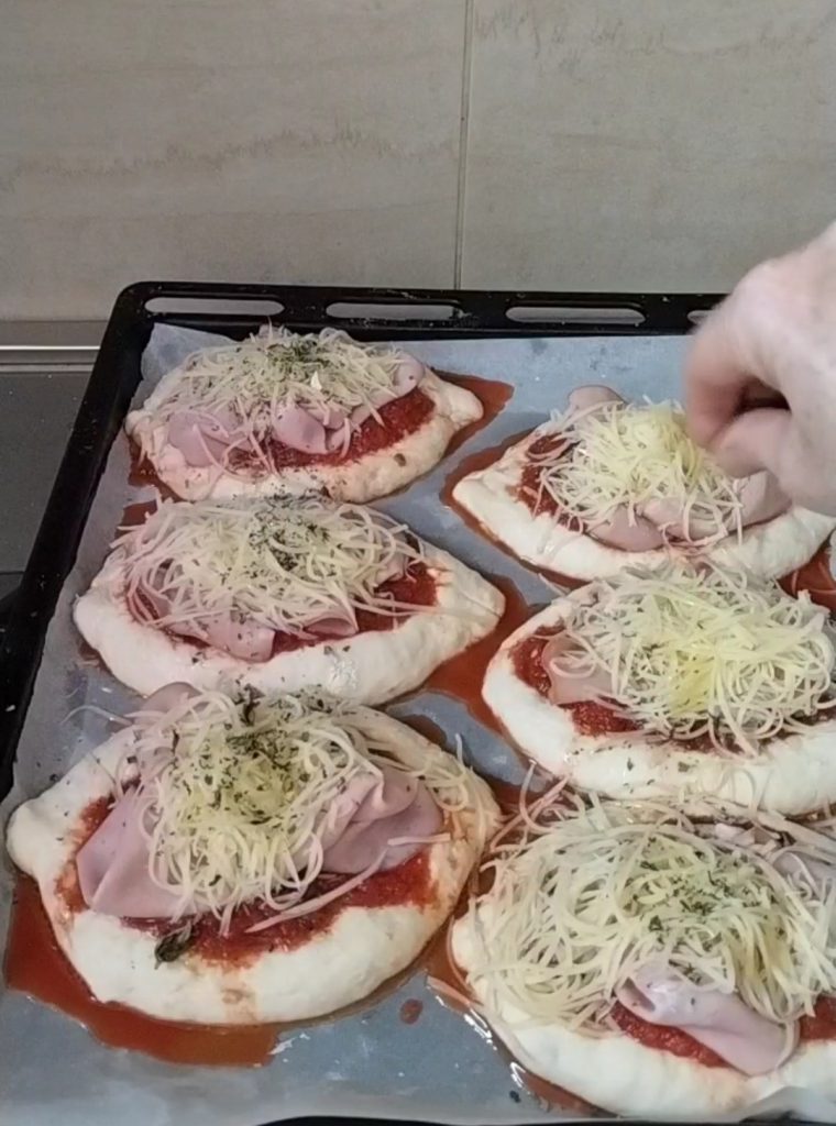 Coloque as barquinhas na assadeira forrada com papel manteiga. Coloque o molho de tomate em uma tigela, tempere com orégano, sal e azeite. Tempere cada pizzinha com uma bela colher de molho.