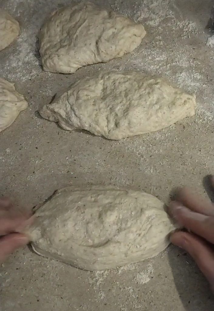 Por volta das 9h, dividi em 6 bolinhas que deixei fermentar por mais 3 horas em uma superfície enfarinhada cobertas com filme plástico e um pano de prato. As bolinhas tinham cerca de 170-180 gramas cada uma.