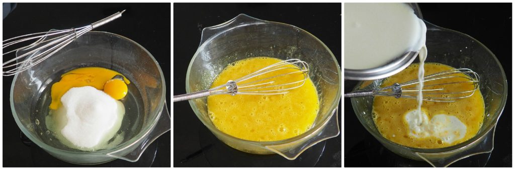 Enquanto isso, coloque em uma tigela os ovos, a gema, a vanilina, bata com um batedor e adicione o leite quente aos poucos, continuando a bater. Para uma consistência sem grumos, passe a mistura em uma peneira.