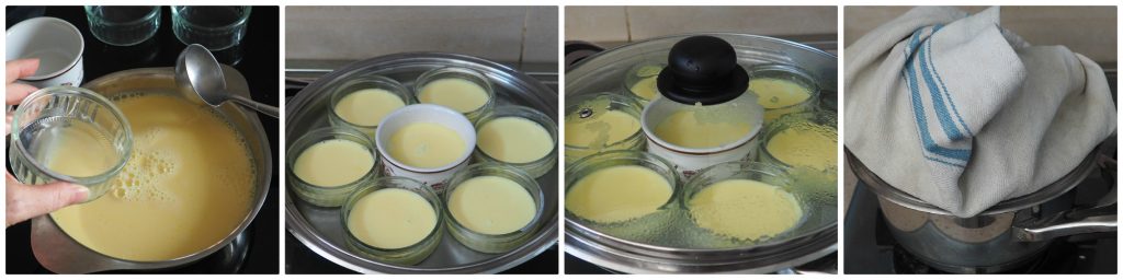 Quando a temperatura da água atingir 90°, cubra com uma tampa que você envolveu em um pano para evitar que as gotas de condensação caiam sobre os pudins e cozinhe por 7/8 minutos.