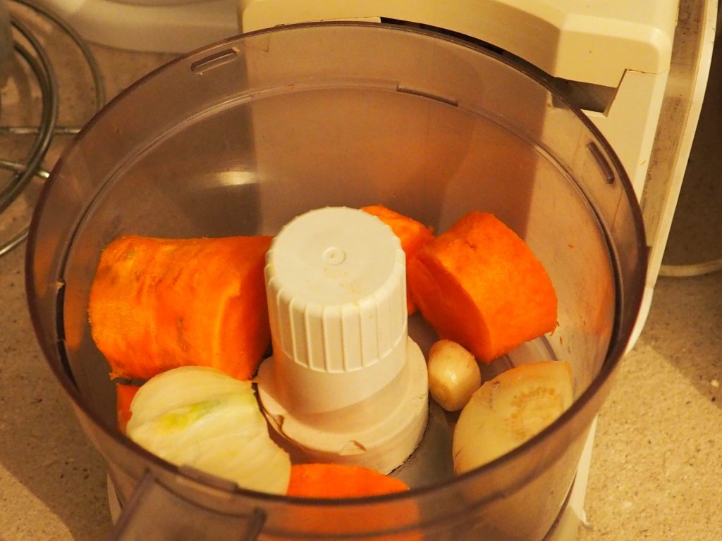 Lave a cenoura e a cebola, limpe-as e corte-as em pedaços grandes.