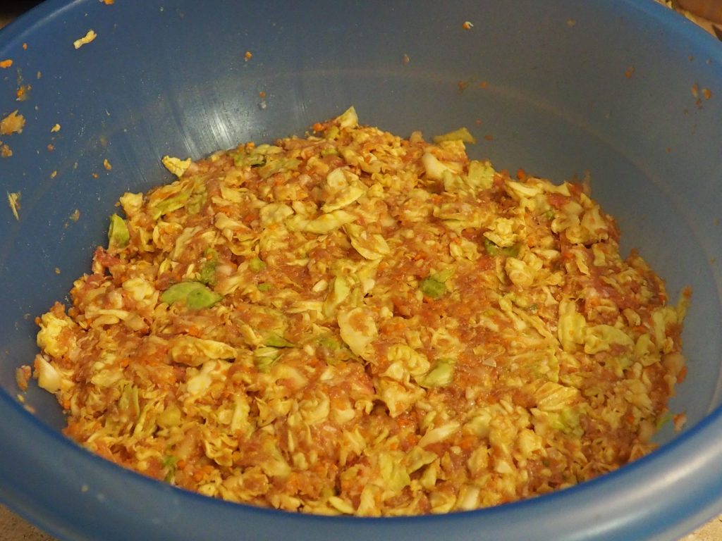 Adicione o repolho à mistura de carne, tempere com molho de soja e gengibre.