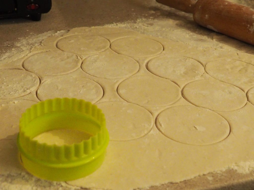 Com um cortador de massa de diâmetro de 8 cm, corte vários discos (consegui 70/80) e posicione-os em uma superfície enfarinhada.
